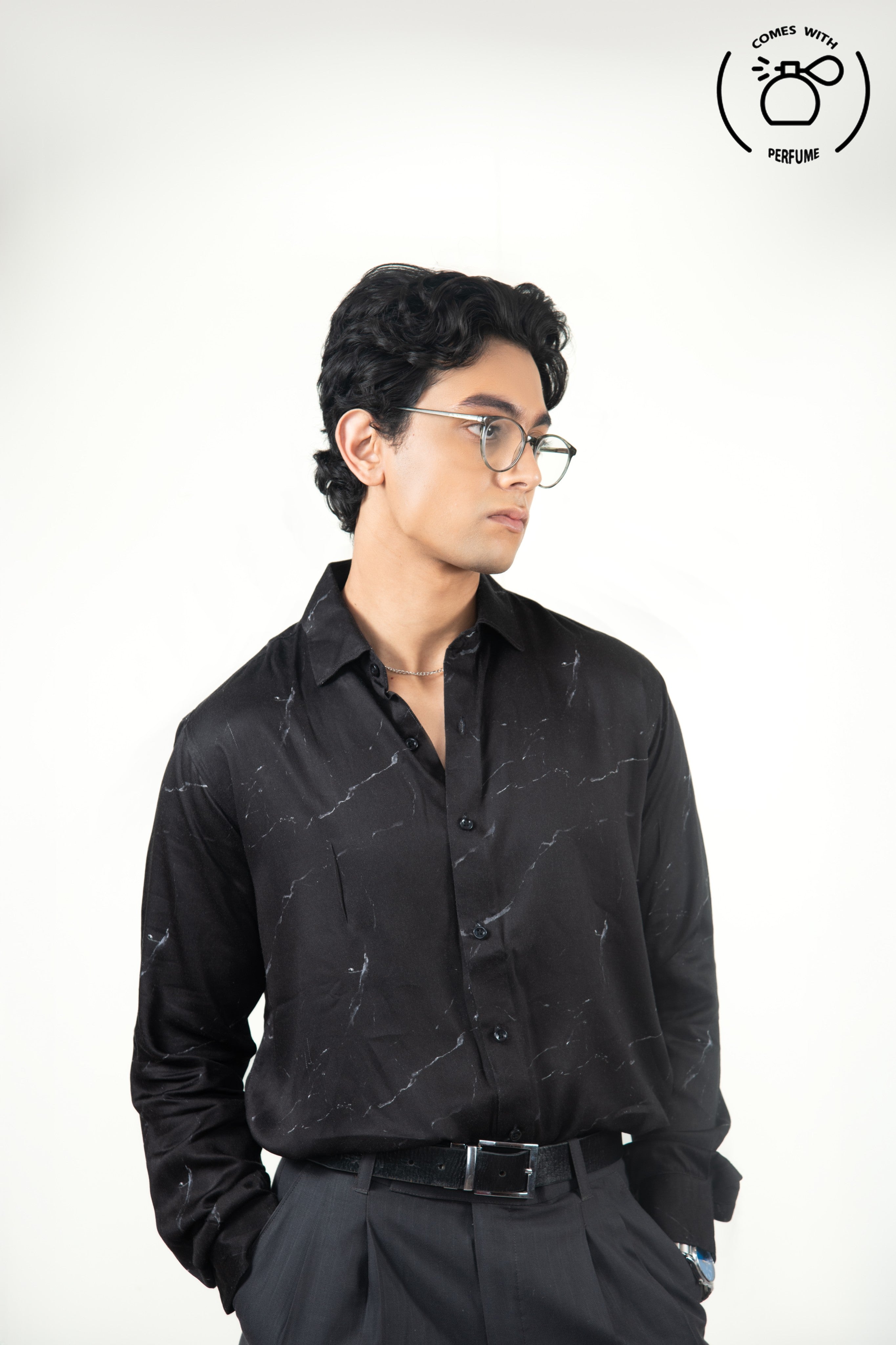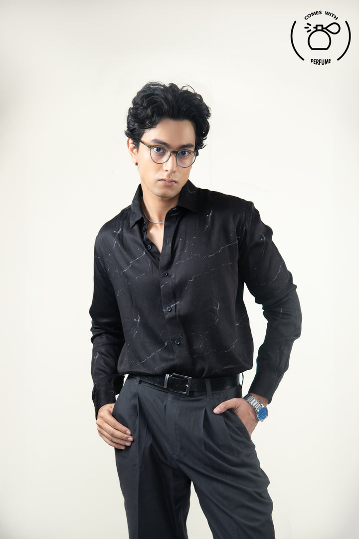 Made from lustrous cotton satin, this full-sleeve printed shirt blends elegance with bold character. Paired with Midnight Aura — a luxurious, sweet, and irresistibly magnetic scent that leaves a lasting impression.